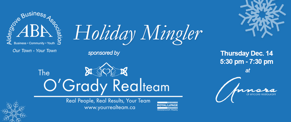 The ABA will be holding our next Mingler, sponsored by The O’Grady Realteam (Royal LePage Wolstencroft Realty), at Annora at Encore Restaurant (27279 Fraser Hwy., Aldergrove) on Thursday, December 14 from 5:30 – 7:30 pm.
